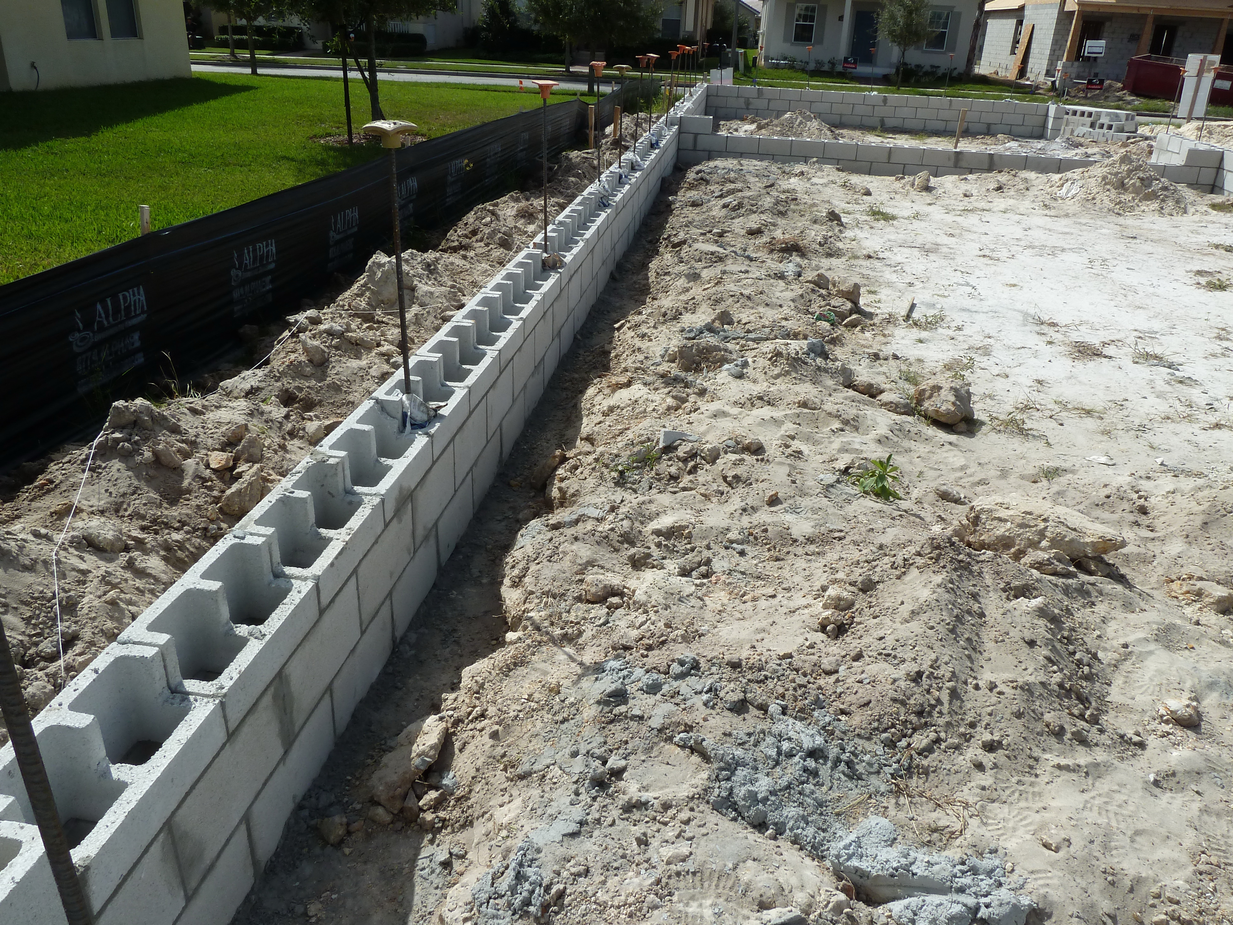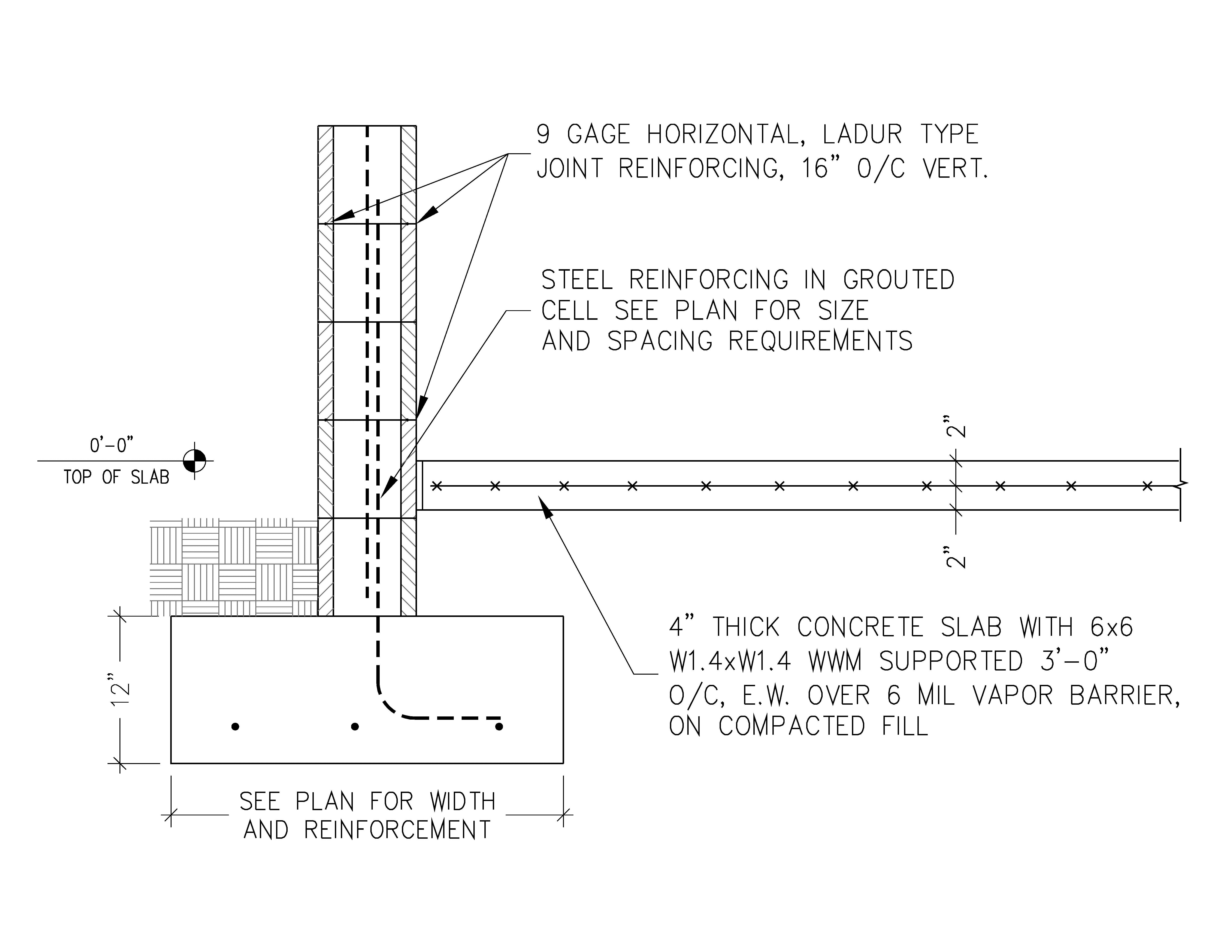 Continuous footings, also referred to as “strip” or “spread” footings, are concrete footings often used to support the load bearing walls in residential construction. This type of footing is shaped as a long rectangular box that is continuous below the supported wall, forming the base of an upside down “T”. The size of residential continuous footings varies with the loading and soil conditions. However, a thickness range of 12” to 16” and width range of 24” to 30” are common. The area of soil or ground covered by the footing and the bearing capacity of the underlying soil determines the footing’s support capacity. Wider and sometimes thicker strip footings are required to support heavier loads. Steel reinforcement is usually provided in strip footings and varies with the design loads and the local building code. The reinforcement typically consists of continuous or “longitudinal” steel bars placed near the bottom of the footing. They may also have shorter steel bars (the width of the footing minus several inches for concrete cover) placed, at regular intervals, perpendicular to and immediately above or below the longitudinal bars. These are sometimes referred to as “transverse” bars. The reinforcing steel provides additional strength and crack control. Strip footings have a structural advantage over a monolithic footing. This advantage arises from the supported wall normally being centered over the footing. This reduces or eliminates eccentricity, or ‘off-center’ loading, which helps to reduce uneven soil bearing pressures and the potential for rotation or settlement. A potential cost disadvantage of strip footings, as compared to monolithic footings, arises from the labor and materials associated with the forming and placing of concrete twice (once for the footings and once for the slab). The supported wall is not always centered on the footing. An example where the wall is often placed off-center is a free-standing retaining wall. A retaining wall “retains” or holds back soil. These walls are often placed so that the footing and wall form an ‘L’. The weight of the retained soil (bearing on the bottom leg) restrains upward movement or overturning of the wall and buried footing, thus increasing its ability to "retain". The soil weight also reduces the likelihood that the footing will move or slide horizontally by increasing the frictional force between the soil and the bottom of the footing. The following sketch is an example of a concrete strip footing supporting a typical CMU residential exterior wall. The slab on grade shown is sometimes referred to as a "floating slab" as it is not structurally connected to the wall. Alternatively, the slab may be placed over the CMU, and the wall started again on top of the slab edge: The following is a photograph showing the early construction of a CMU wall supported by a continuous footing. The footing itself is covered by dirt, and is not visible in the photograph. The interior slab has not yet been prepared or placed. The vertical steel bars protruding at the top of the wall were placed with and protrude from the top of the footing. They are intended to lap with the vertical steel bars dropped into the top of the wall after the CMU wall block is in place: ADDITIONAL RESOURCES: ACI 117 - Standard Specification for Tolerances for Concrete Construction and Materials ACI 318 - Building Code Requirements for Structural Concrete ACI 332 - Residential Code Requirements for Structural Concrete