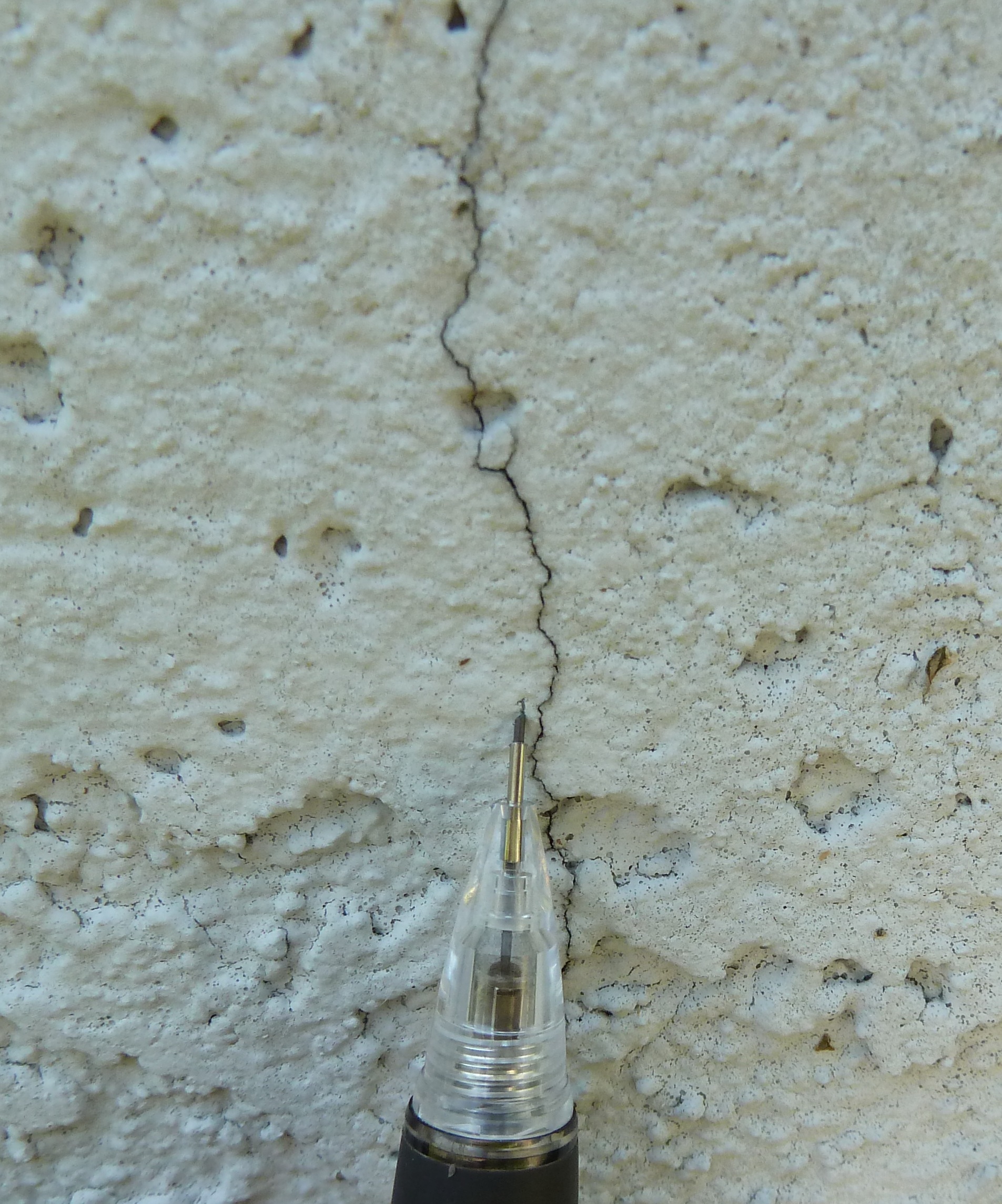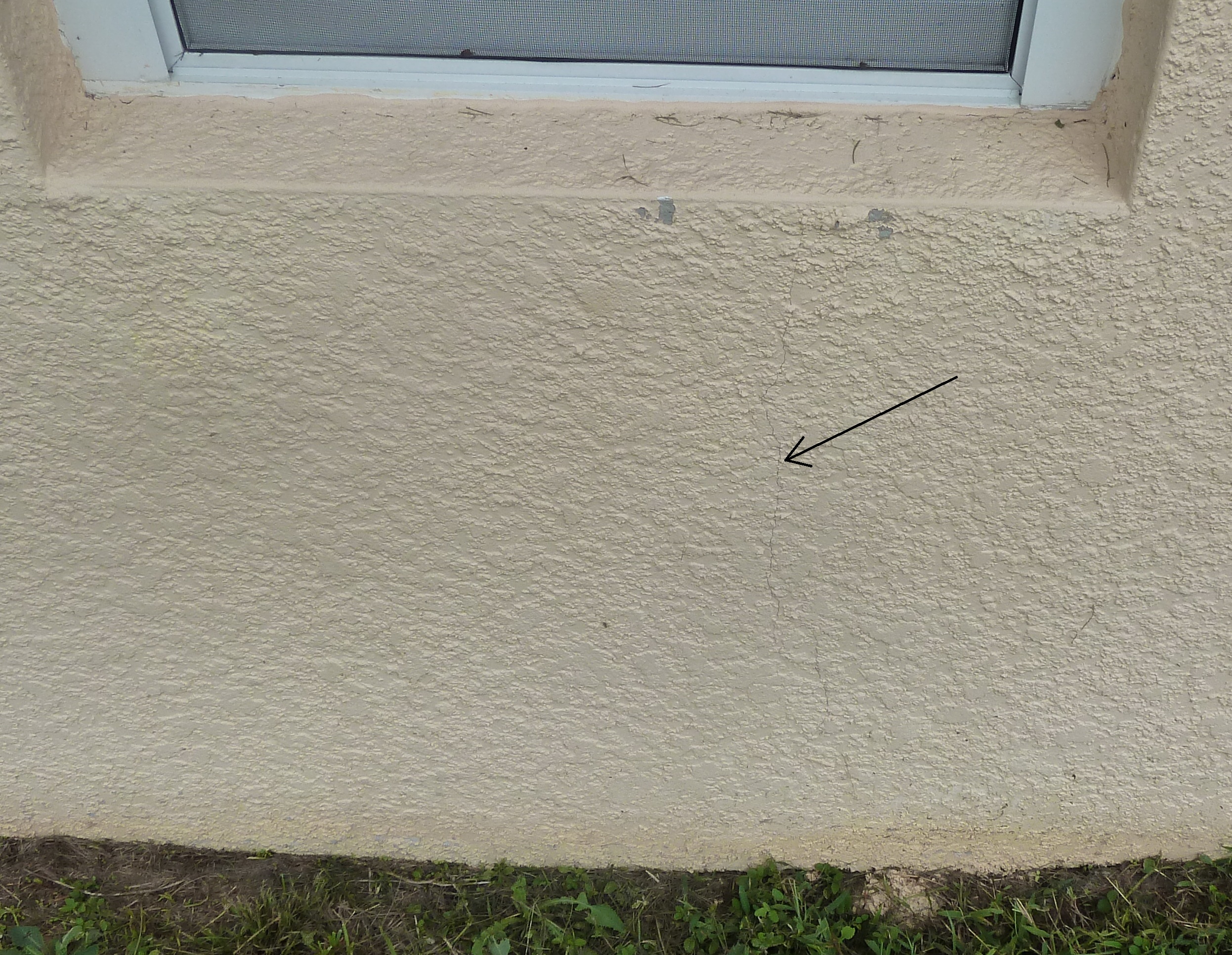The following is a photograph of a crack in exterior stucco typical of CMU wall shrinkage and restrained thermal movement: