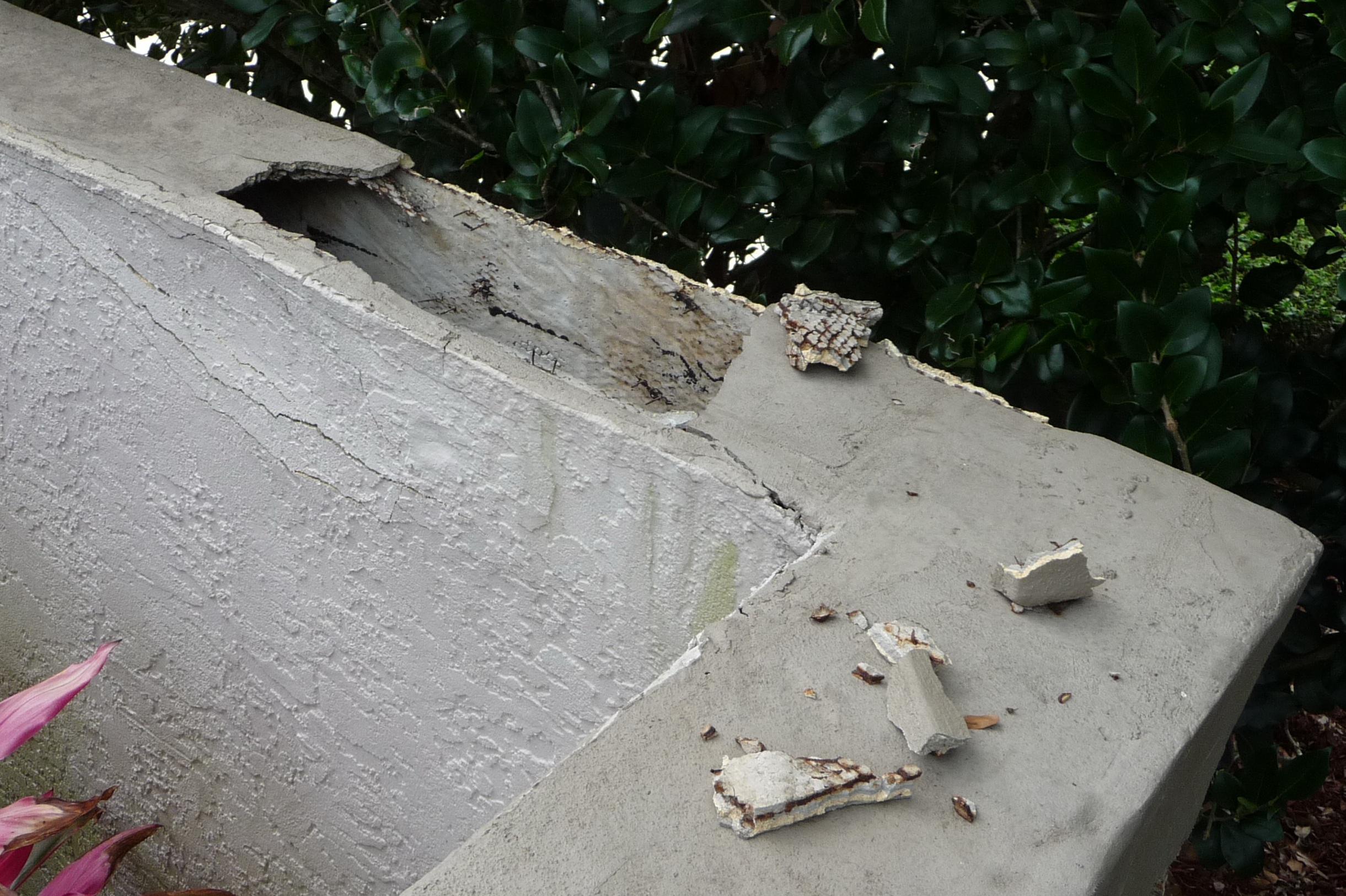 The following photograph shows an area of stucco collapsed at the top of a wood-framed exterior privacy wall: