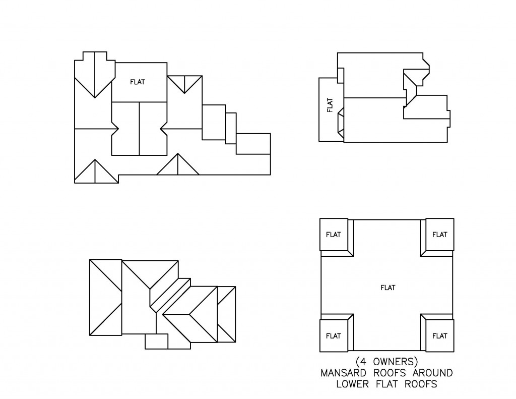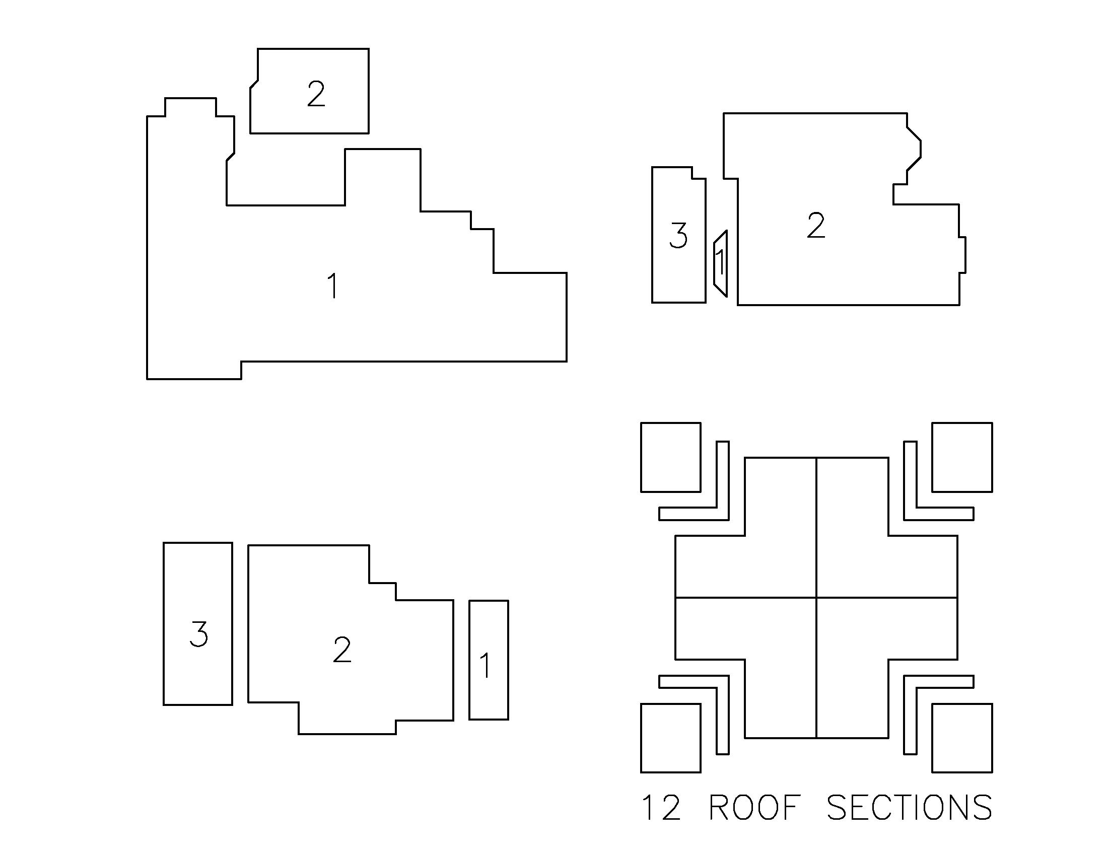 The following are four roof examples in plan view:Find below the same roofs broken apart into roof sections. A common misconception is that roof sections are defined by roof slopes. This is not the case if the roof slopes are only divided by valleys or ridges. The cross shaped lines through the lower right roof plan indicates section divisions by legal description: