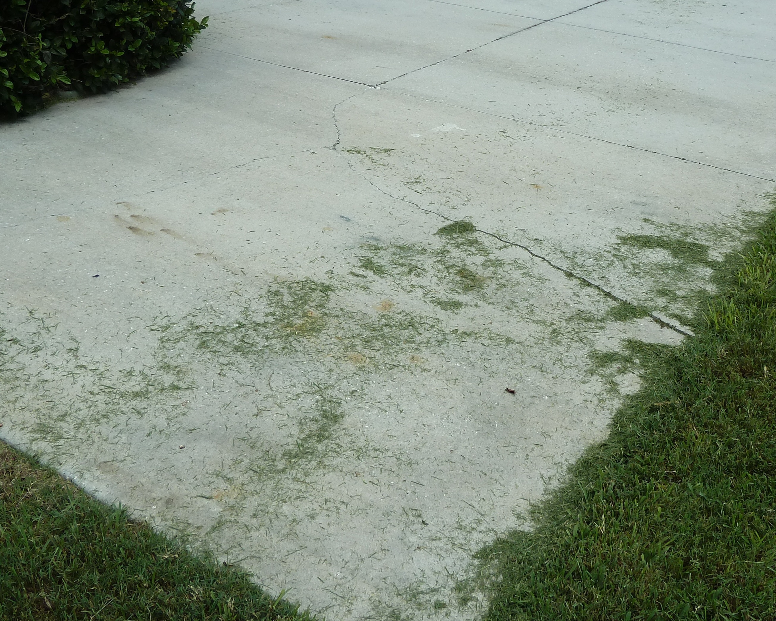 A concrete slab on grade relies on the underlying soil for its support. As such, the soil beneath the slab is considered to be a primary component of this structural system. Changes that occur in the soil after a slab is placed can have a significant detrimental effects on the slab, and may include consolidation of organic material or loose sand, variations in the water content of clayey soils, and erosion of the soil from beneath the slab. Many of these changes and their harmful effects occur over a significant period of time. The soil beneath a slab must be properly prepared prior to concrete placement in order to avoid or minimize such harmful changes and their effects on the structure. The possible effects of sinkhole activity are not considered in this discussion. Full support of the underlying soil allows a slab on grade to be constructed with little or no steel reinforcement. As concrete is strong in compression, a fully supported concrete slab easily transfers normal residential loads into the soil directly beneath the slab. However, the tensile strength of plain concrete is usually only 10 to 15% of its compressive strength. Therefore, without reinforcement, concrete is very susceptible to cracking due to bending, which induces tensile forces within the slab. Shear is another potential cause of cracks in concrete slabs. The shear strength of plain concrete is a function of its compressive strength and the area potentially affected by shear failure. Bending and shear develop within a floor slab or other structure that is partially supported or only supported at intervals. These forces are relieved when the slab cracks and settles, often under its own weight. A small amount of settlement is normally considered in new building design since all new structures founded on shallow foundations settle. Structural damage does not usually occur as the result of settlement alone. For instance, if an entire building with all its foundations 'sank' exactly one foot into the earth at the exact same rate, the building itself would not be structurally scathed by the settlement alone. It is differential settlement that usually causes structural problems. Differential settlement occurs when one portion of a building or structure settles more than another. This differential movement induces unexpected and potentially severe forces within a structure, causing structural damage. Settlement occurs for a number of reasons usually related to the initial preparation of the soil beneath the slab. Cohesionless soil (sand) that is not properly compacted prior to slab placement is susceptible to consolidation due to applied pressure and fluctuations in the water table. These fluctuations may occur during periods of heavy rain. In dry sand, internal friction and shear resistance increase with applied pressure. However, hydrostatic buoyancy reduces the pressures between the sand particles by about 50%. This translates into an approximately equal loss in soil bearing capacity, and effectively doubles the expected settlement. Organic materials left beneath a slab may decay or move with applied pressure over time. Clayey soils are susceptible to plastic deformation, and may swell or shrink with more or less water content. Erosion of support soil beneath or at the perimeter of a slab on grade is also a likely cause of settlement. This may occur as the result of missing or poorly directed gutter downspouts, groundwater runoff at steep grades, etc. In summary, concrete slabs on grade need complete support from the underlying soil as they are not able to sustain their own unsupported weight. As such, a slab may crack and settle if the support soil is adversely affected, lost or diminished. The following photograph shows significant settlement at the corner of a concrete driveway slab: The next photograph shows differential vertical movement across a settlement crack in a slab on grade: