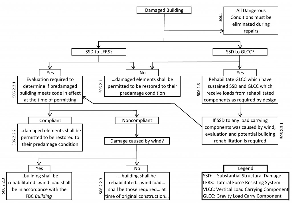 Paragraph 402.3 states: "Work on nondamaged components that is necessary for the required repair of damaged components shall be considered part of the repair and shall not be subject to the provisions of Chapter 6, 7, 8, 9, or 10." This means that the 'Alteration' requirements do not apply to "repair only" work. Substantial Structural Damage Building codes have changed over the years, and the codes in Florida have generally become more stringent. An older building will likely not meet today's code requirements, and the FBC requires that if a building is damaged beyond certain thresholds, it should be rehabilitated to meet the current code if the nature and extent of damage meets certain criteria. This is particularly true if the building did not meet the code in effect at the time of its construction. The FBC defines the term 'Substantial Structural Damage' (SSD) which is used to determine what, if any, code upgrades must be incorporated as part of the repairs to a damaged building or structure. The FBC defines SSD as follows:"In any story, the elements of the lateral-force-resisting system (LFRS) have suffered damage such that the lateral load-carrying capacity of the structure in any horizontal direction has been reduced by more than 20 percent from its pre-damaged condition; or