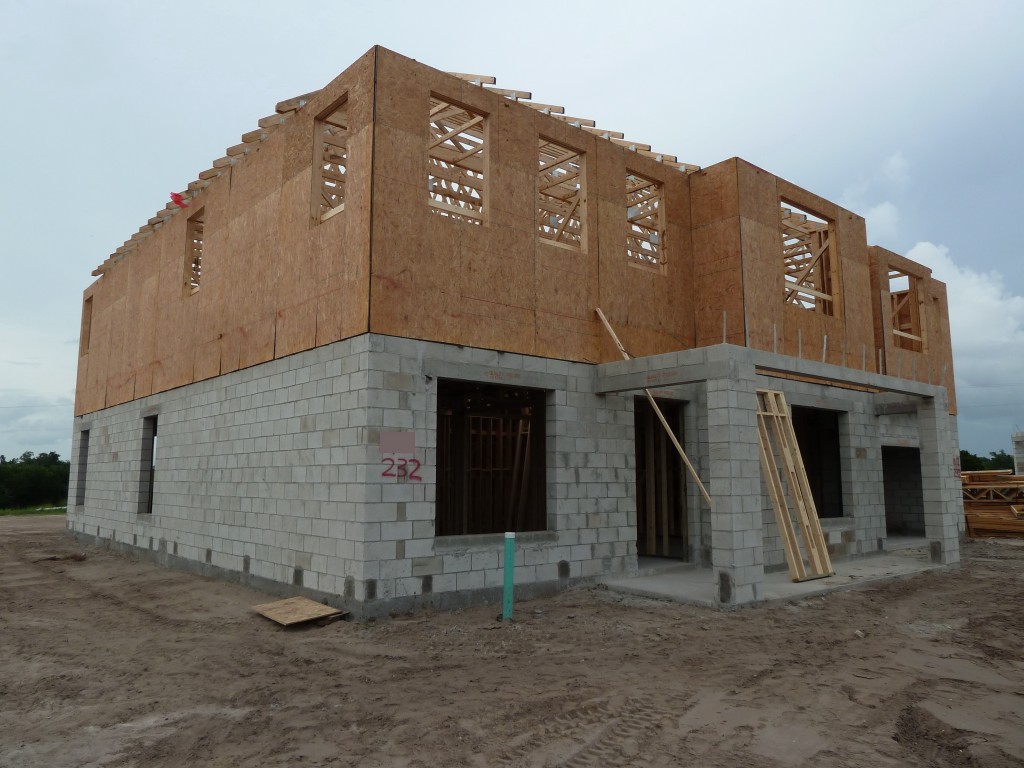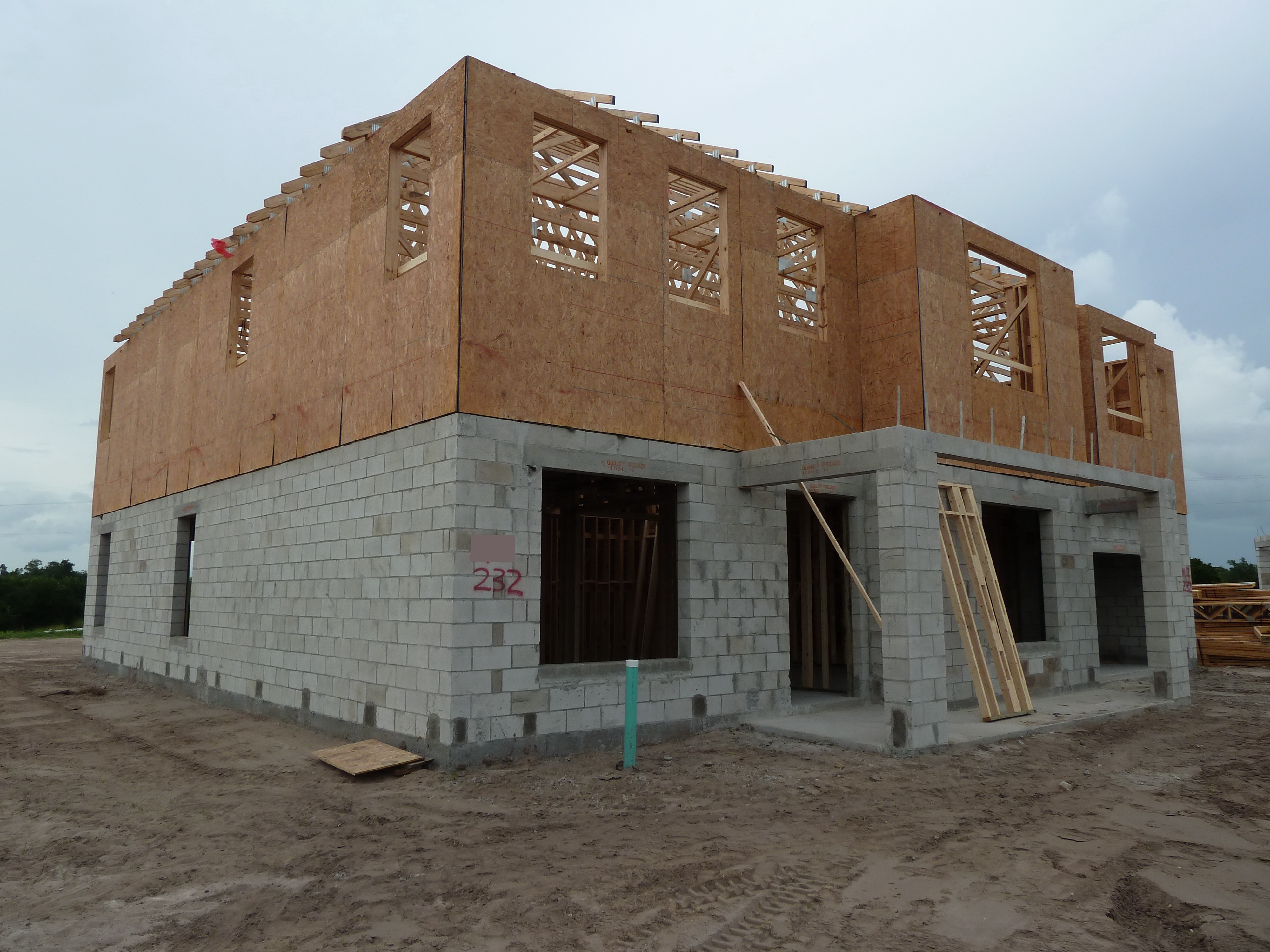 Wood framed load bearing walls (sometimes referred to as 'stick framed') are common in residential construction. Many homes are constructed entirely of wood framed walls at both the interior and exterior. 2x sawn lumber is most commonly used for wood framed walls. While wood framing varies with the specific structure and need, all framed walls have the same basic components. There are several advantages and disadvantages when comparing wood framed walls to CMU block walls. For a given wood framed wall, all members typically have the same cross sectional. For example, a 2x6 wall will normally have a 2x6 bottom plate, 2x6 studs, 2x6 top plate, 2x6 sills, etc. Most modern wood framed homes are constructed with 2x4 or 2x6 inch nominal standard dressed lumber. The actual size of these members is 1-1/2 x 3-1/2 and 1-1/2 x 5-1/2 inches, respectively. The basic components of a wood framed wall are the bottom plate, the vertical members (studs) placed at regular intervals, the top plate, connectors, and (in the case of exterior walls) sheathing. Walls also have such members as cripples, headers, and sills which are used to provide openings in the wall. The bottom plate typically consists of one single pressure treated member that is bolted, pinned, strapped, or nailed to the slab, foundation, floor, or beam which supports it. Pressure treated wood should be used for the bottom plate if it is in contact with concrete or masonry, or otherwise likely to be exposed to adverse conditions such as high moisture. The bottom plate effectively acts as blocking with regards to gravity loads in the studs. In other words, the studs transfer weight directly through the bottom plate into the structure beneath. Sheathing may also transfer gravity loads to the bottom plate. The connections between the bottom plate and the supporting structure may also be subjected to uplift or shear forces. The studs are vertical members spaced at regular intervals that typically vary between 12 and 24 inches. The spacing between the studs may vary with the expected loads on the wall, the height of the wall, and the species and grade of the wood used. In areas subjected to significant wind loads, the stud connection to both the top and bottom plate should be sufficient for a continuous load path from the top plate to the foundation. An example of this type connection would be a flat steel strap bent into a U-shaped connector that is placed over the plate at the studs, and nailed to both side of the stud. The top plate of a load bearing wood framed wall consists of two horizontal members secured to the top of the studs. The top member of the top plate laps over perpendicular intersecting walls. The top plate members should lap over each other at joints so as to provide a continuous tensile load path, which may occur due to diaphragm action. The top plate also transfers gravity and uplift loads to the studs below. Walls are either prefabricated elsewhere and delivered, or hand framed on site. When constructed on site, they are generally assembled on a floor, slab, or other flat horizontal surface. The top and bottom plates are placed together, marked, then separated (still parallel) the length of the studs. The studs are crowned and put into place along with the headers, cripples, sills, and other framed members associated with wall openings. The entire assembly is then fastened together, often with 16d common nails and whatever additional connectors are required. In the case of exterior walls, the sheathing is installed either before or after the wall is lifted and fastened in place. The species and grade of the wood used in load bearing walls varies, but Southern Yellow Pine #2 may be the most common. Different species and grades may be chosen based on their availability, price, strength, moisture resistance, or aesthetics. Some species such as Cedar and Cypress are naturally decay resistant. There are advantages and disadvantages of wood framing compared to CMU block walls. One of the most significant advantages is thermal insulation. The cavities between the studs allow fiberglass or other efficient insulation. Wood framed walls are lighter than CMU. This fact may allow smaller footings, but require greater attention to wind uplift forces. Wood framing is generally considered less expensive than CMU, but this depends upon local availability and cost of materials and labor. Framed walls are more flexible than CMU, may therefore may be less susceptible to cracking from settlement. However, stucco over wood framed walls is susceptible to cracking due to swelling of the wood. Probably the most significant disadvantage of wood framing is its susceptibility to rot and insect damage. The following photograph shows a stack of prefabricated wood framed walls delivered to a jobsite: The following photograph shows wood framed 2nd floor exterior walls stacked on 1st floor CMU walls. The wood framed walls are sheathed with OSB, and the roof truss installation is in progress: The following photograph shows a wood framed interior wall supporting prefabricated wood floor trusses. Note the vertical truss webs located immediately above the wall: ADDITIONAL RESOURCES: National Design Specification for Wood Construction Timber Construction Manual
